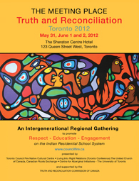 The Meeting Place: Truth and Reconciliation Toronto 2012, was a wonderful community-based regional truth and reconciliation gathering organized by Toronto Council Fire Native Cultural Centre; Toronto Living into Right Relations Circle, United Church of Canada; Canadian Roots Exchange; and the Centre for Aboriginal Initiatives, University of Toronto, in May 2012.
